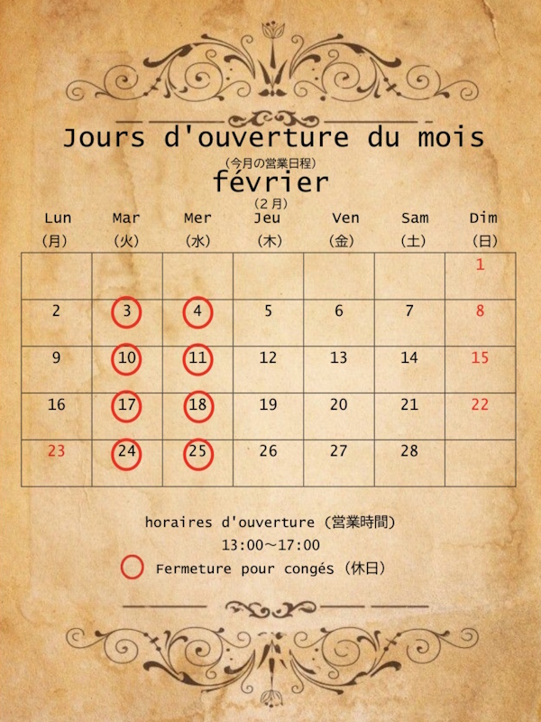 2026年2月のお休みは毎週火曜日、水曜日となっております。
