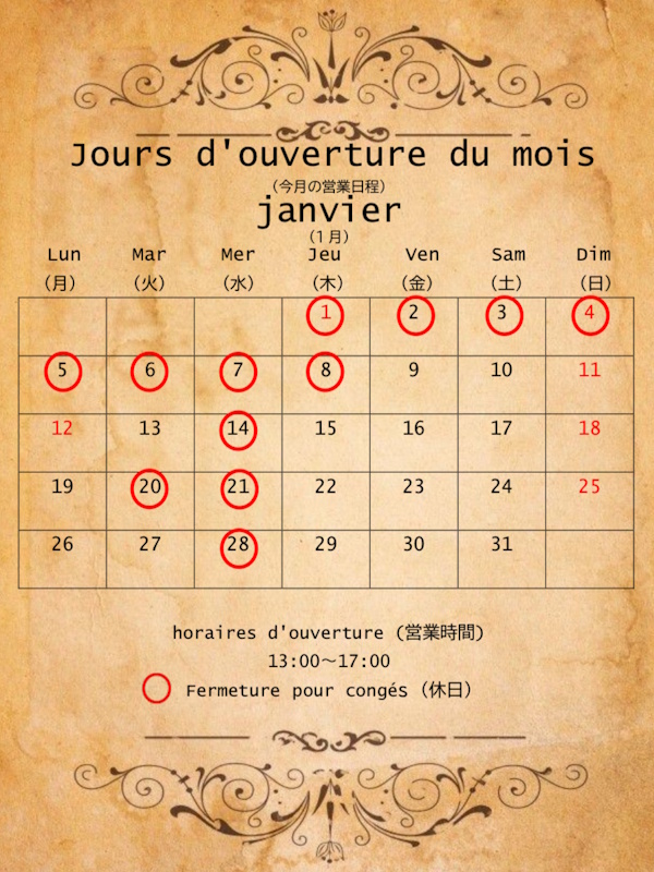 2026年1月のお休みは、1日(木)~8日(木)、毎週水曜日、20日(火)となっております。