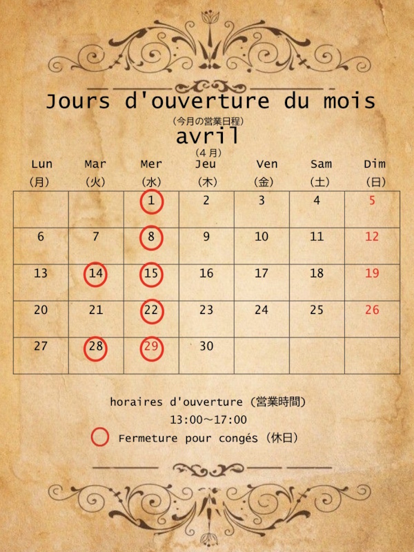 ~2026年4月の営業日のご案内~ 2026年4月のお休みは14日(火)、28日(火)と毎週水曜日となっております。