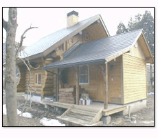 米松を使った、本格的ログハウス。 施工中の作業小屋は、唐松を使用。 |